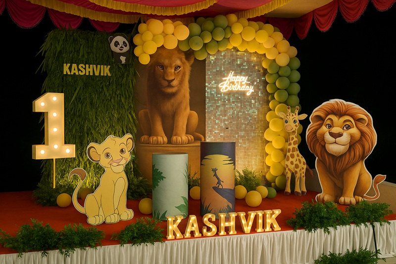 A child’s first birthday is an important milestone, and selecting the right theme creates a memorable celebration for both family and guests. Recently, the DayYours team completed a Lion King–themed 1st birthday decoration for baby Kashvik at Nolambur, Tindivanam. The rooftop venue was transformed into a vibrant jungle atmosphere using greenery, character standees, and earthy