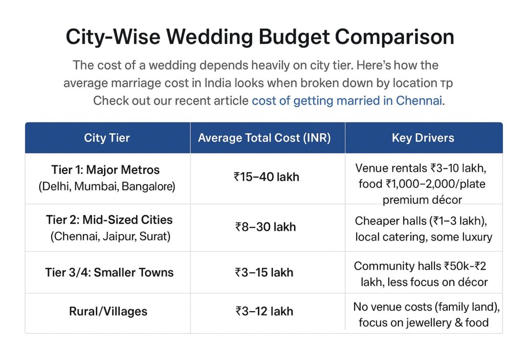 | Tier 2: Mid-Sized Cities (Chennai, Jaipur, Surat) | ₹8–30 lakh | Cheaper halls (₹1–3 lakh), local catering, some luxury |