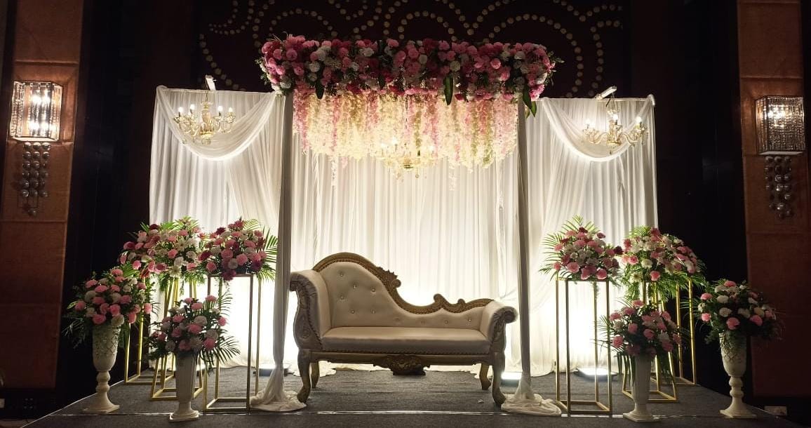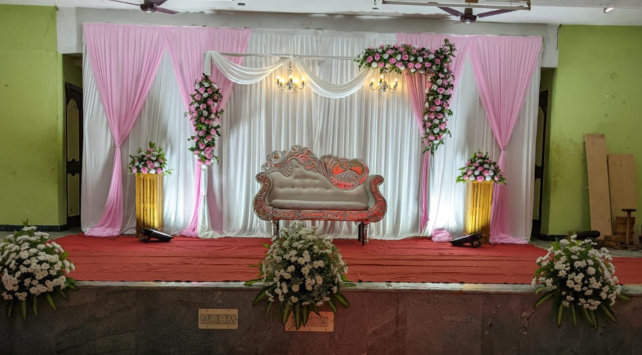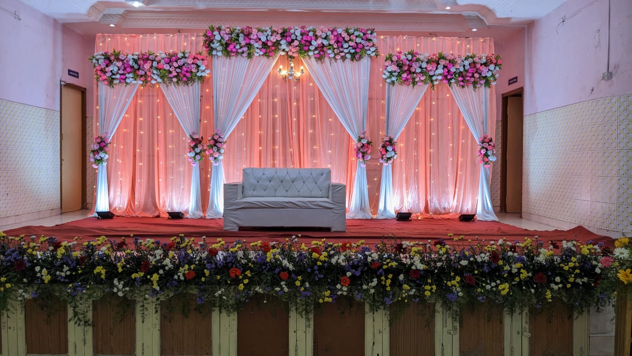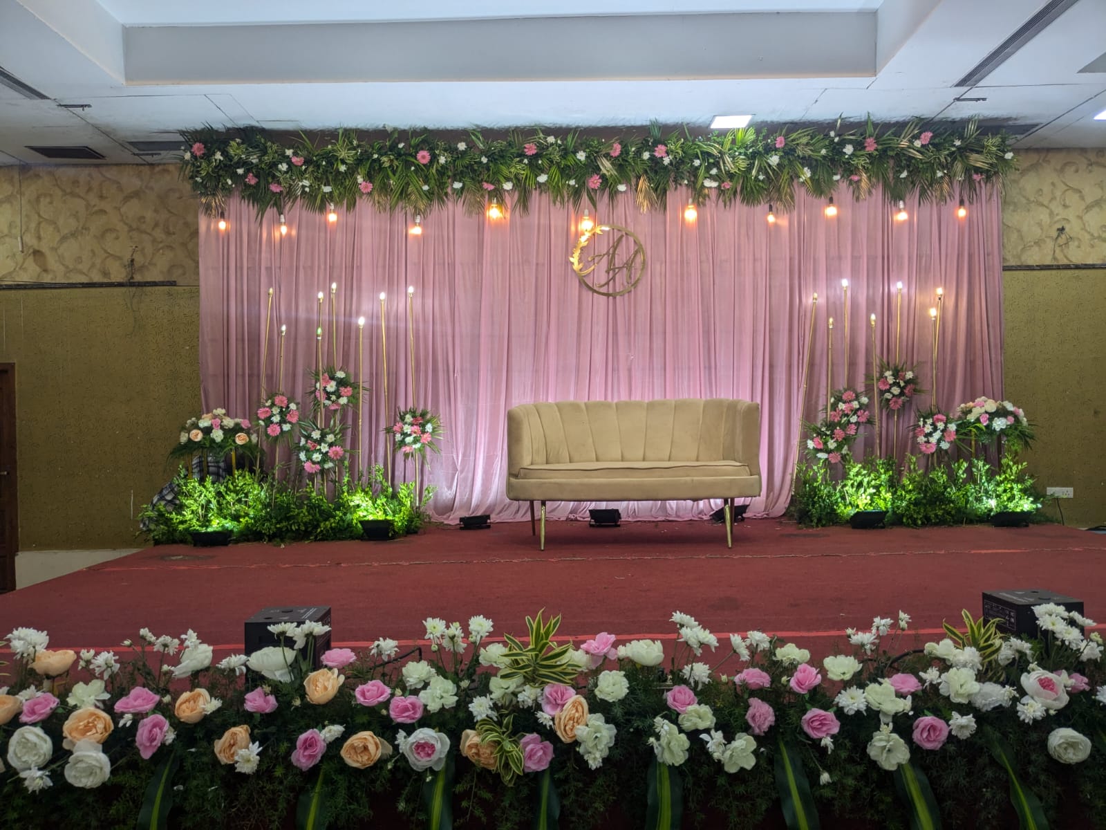 Perfect for intimate weddings or small halls. Includes simple floral backdrop, draping, and elegant lighting.