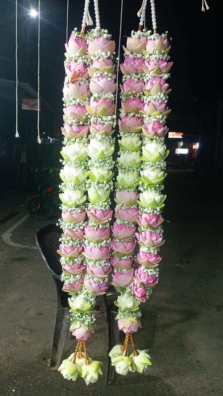 Elegant and divine, lotus garlands symbolize purity and new beginnings. Perfect for traditional temple weddings and reception looks.