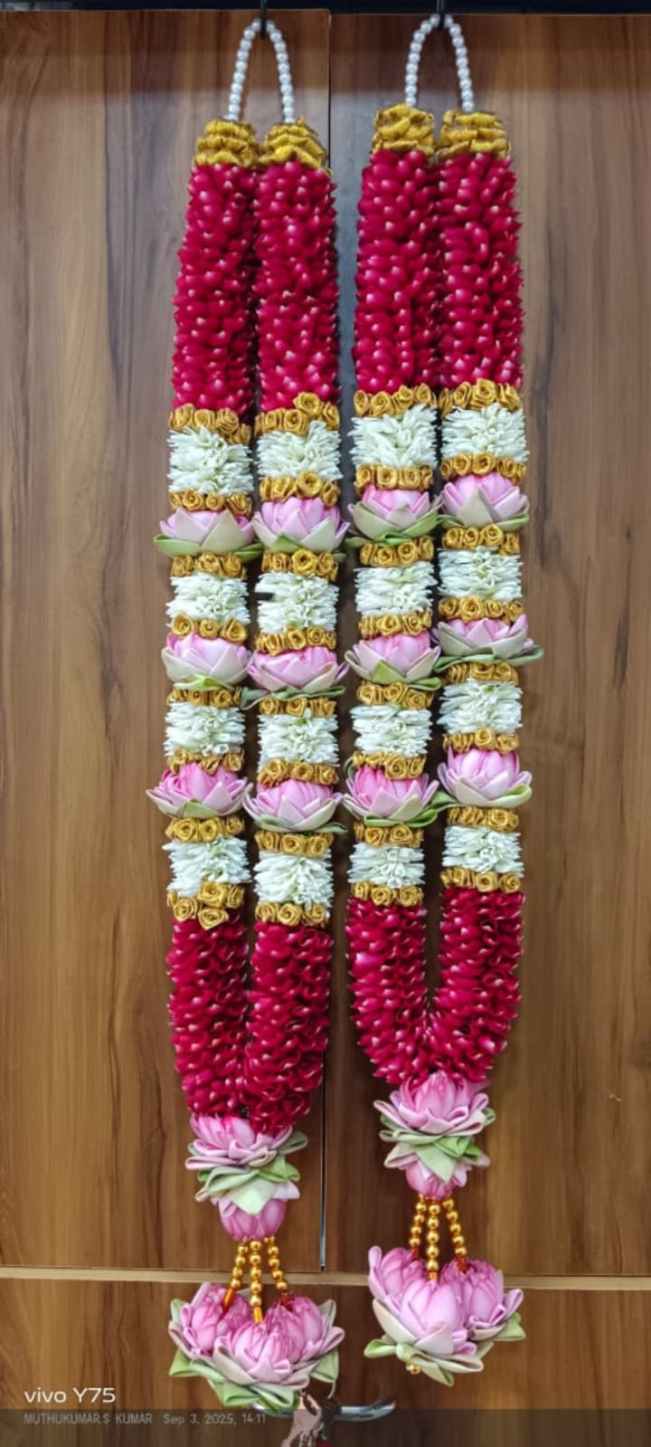 From traditional lotus and rose designs to modern floral creations, our handcrafted wedding garlands (Kalyana Maalai) add elegance and charm to every ceremony.